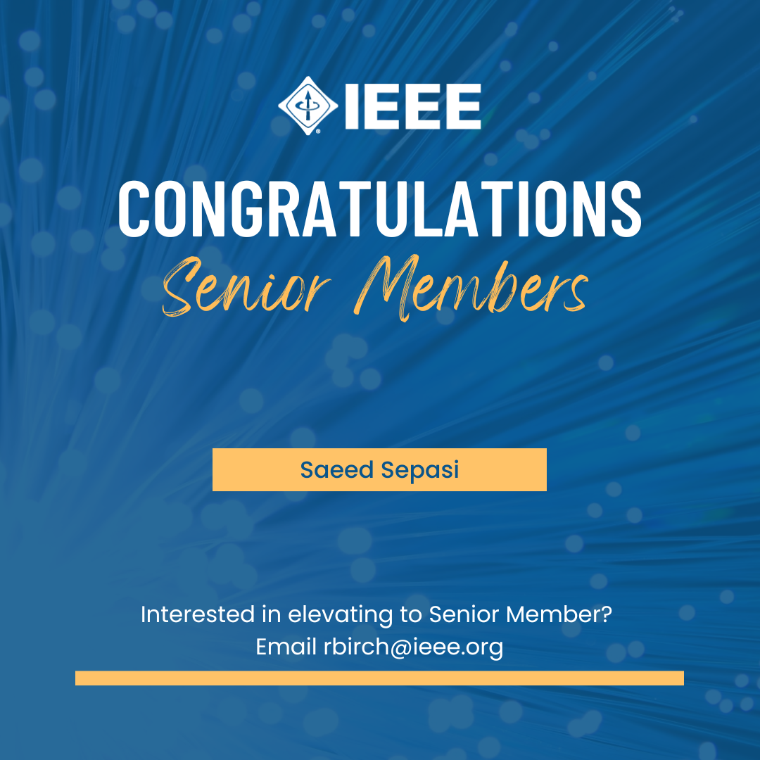 | On behalf of the IEEE community, the IEEE Hawaii Section is pleased to recognize Saeed Sepasi as recently elevated to Senior Member. Senior member is the highest grade for which IEEE members can apply. It reflects experience and professional maturity in IEEE-designated fields.